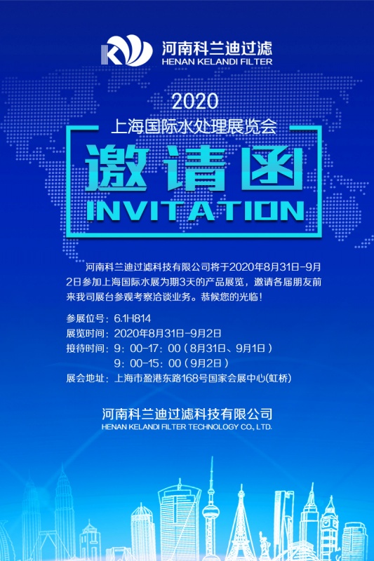 河南科蘭迪過濾科技有限公司將于2020年8月31日-9月2日參加上海國(guó)際水展為期3天的產(chǎn)品展覽,歡迎各屆朋友前來我司展臺(tái)參觀考察洽談業(yè)務(wù)。恭候您的光臨!